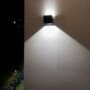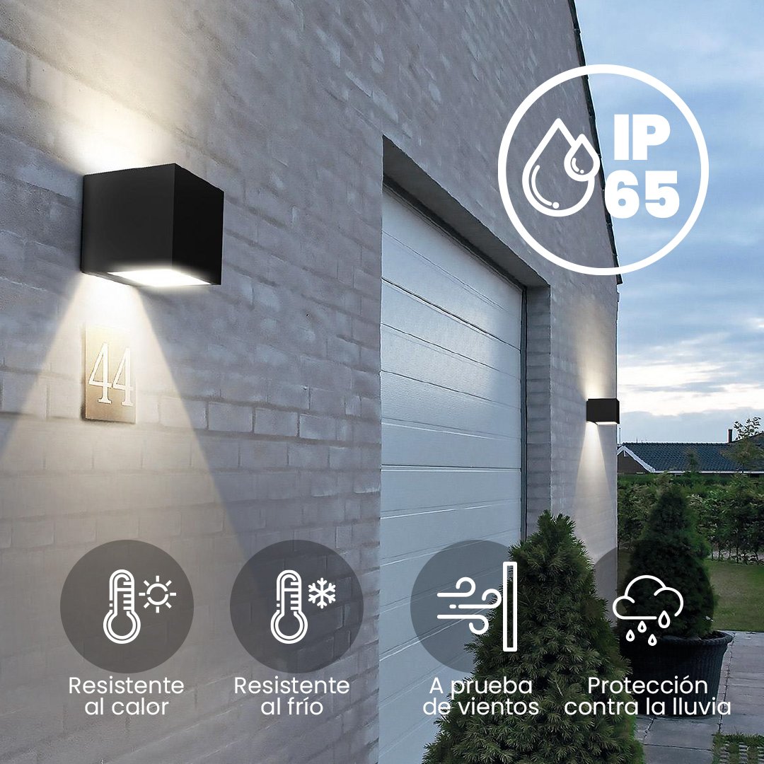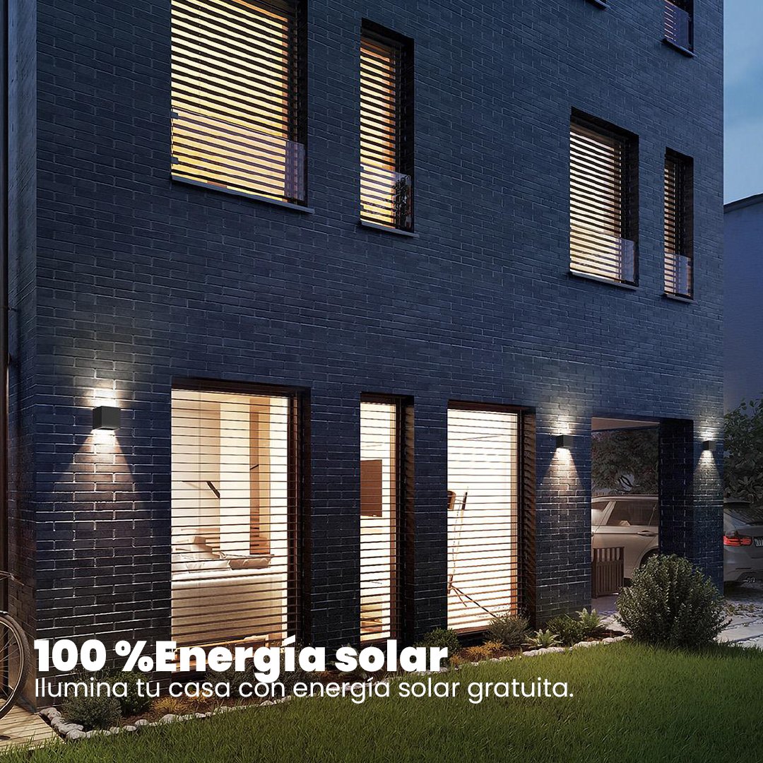Lámpara solar de pared con diseño bidireccional. 700 lúmenes, autonomía de 24 horas y fácil instalación. Ideal para fachadas y entradas.