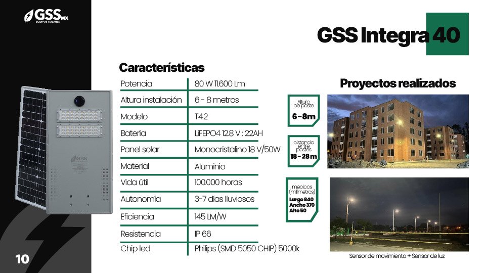 Luminaria solar de 40W con batería LiFePO4. Ideal para calles secundarias y áreas residenciales.